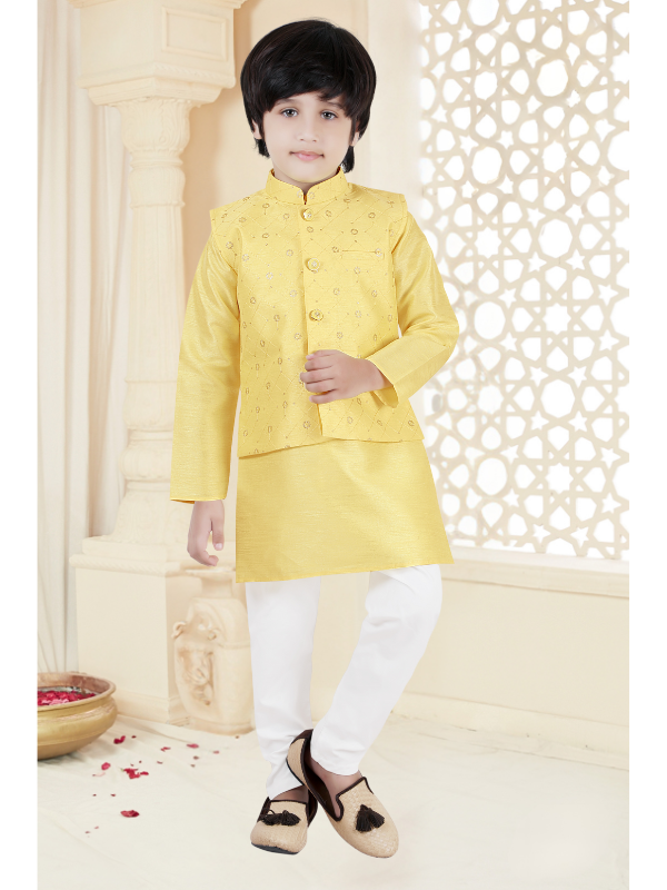 Boys Traditional With Work Chudidar Kurta with Koti - Yellow