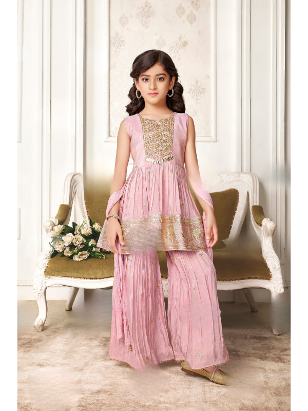 Girls Traditional Sleeves Less Sharara Set - Peach