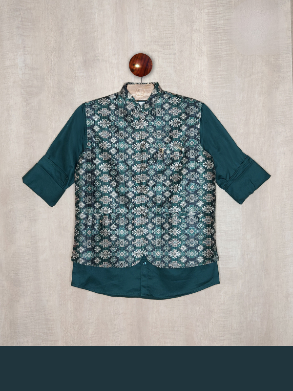 Boys Party Waist Coat with Shirt High Neck-Green