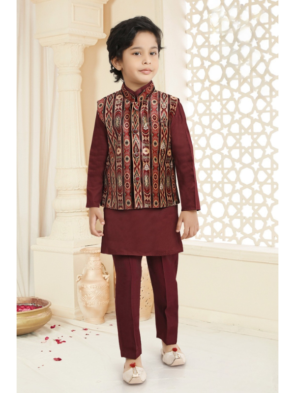 Boys Traditional Printed Chudidar Kurta with Koti - Maroon