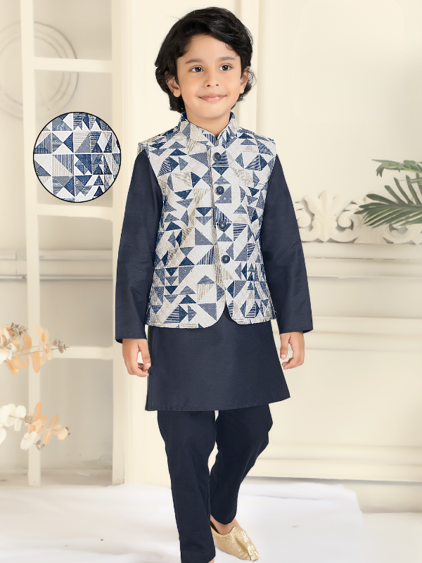 Boys Traditional Printed Chudidar Kurta with Koti - Navy Blue