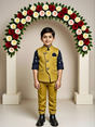 Boys' Stylish Mustard Yellow Nehru Jacket Suit with Navy Blue Printed Kurta and Trouser Set