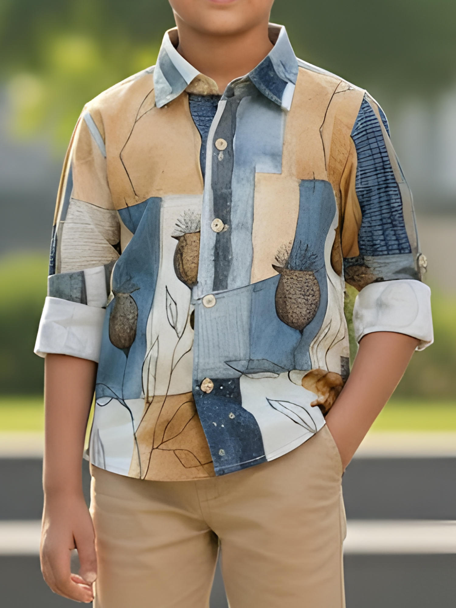 This artistic casual shirt features a sophisticated blend of earthy tones and abstract motifs on a soft cream base. Crafted for a smart-casual appeal, it offers a modern silhouette that pairs effortlessly with trousers or denims for a polished look.