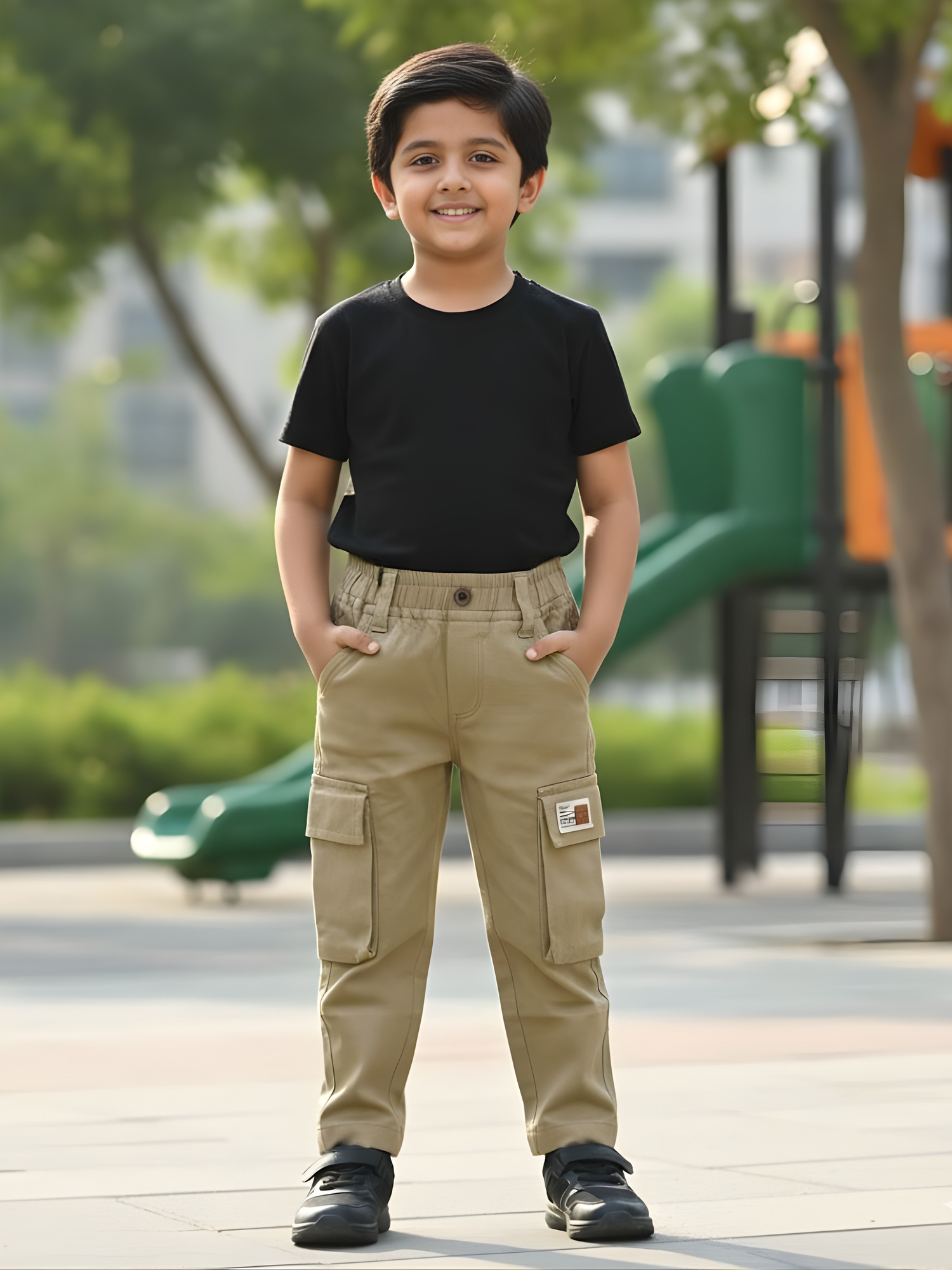 These stylish cargo pants for boys offer a blend of durability and everyday comfort, featuring a versatile brown shade that pairs easily with any top. Designed with functional side pockets and an elasticated waistband, they provide a perfect fit for active kids on the go.