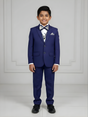 | Pattern / Work | Solid Navy Blue Blazer and Trousers with a Printed Waistcoat, Pocket Square, and Matching Bow Tie |