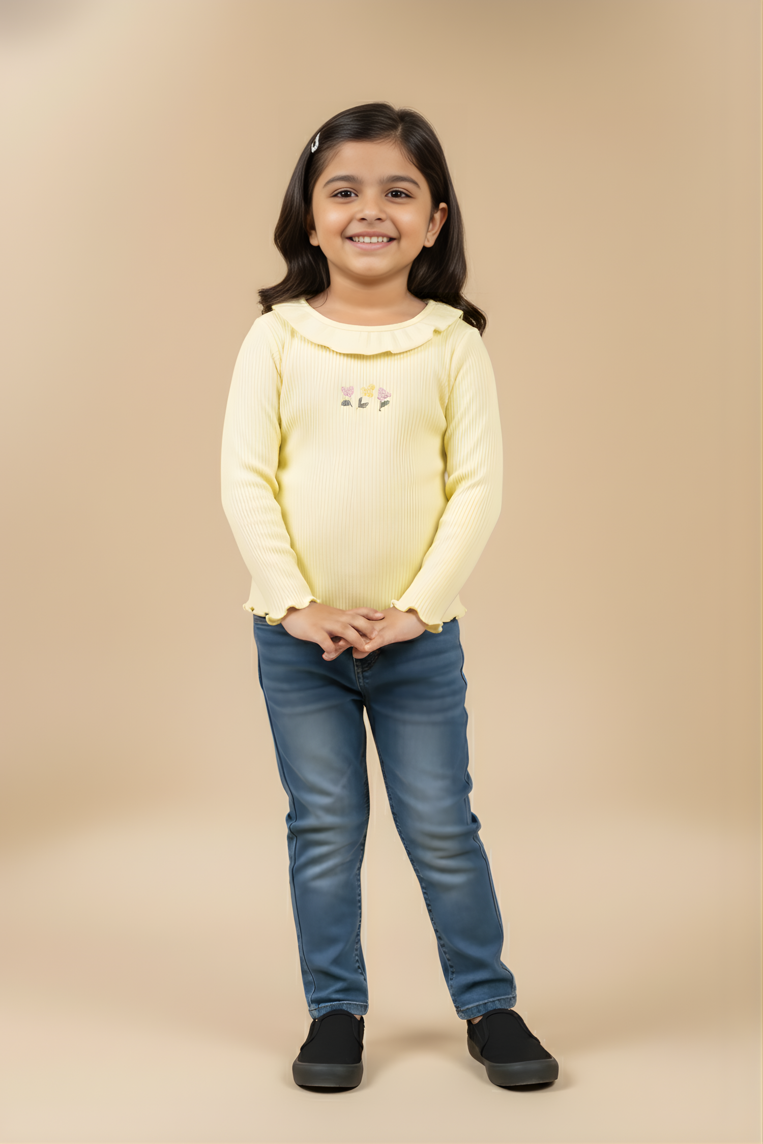 This cheerful Yellow Ribbed Knit Top for girls is a bright and cozy staple for her casual wardrobe. The top features a feminine ruffled trim collar and charming lettuce-edge details on the cuffs and hemline. The cheerful yellow color is complemented by sweet small floral embroidery on the chest, adding a delicate contrast. Made from a ribbed knit fabric, it ensures both a comfortable fit and a stylish look.