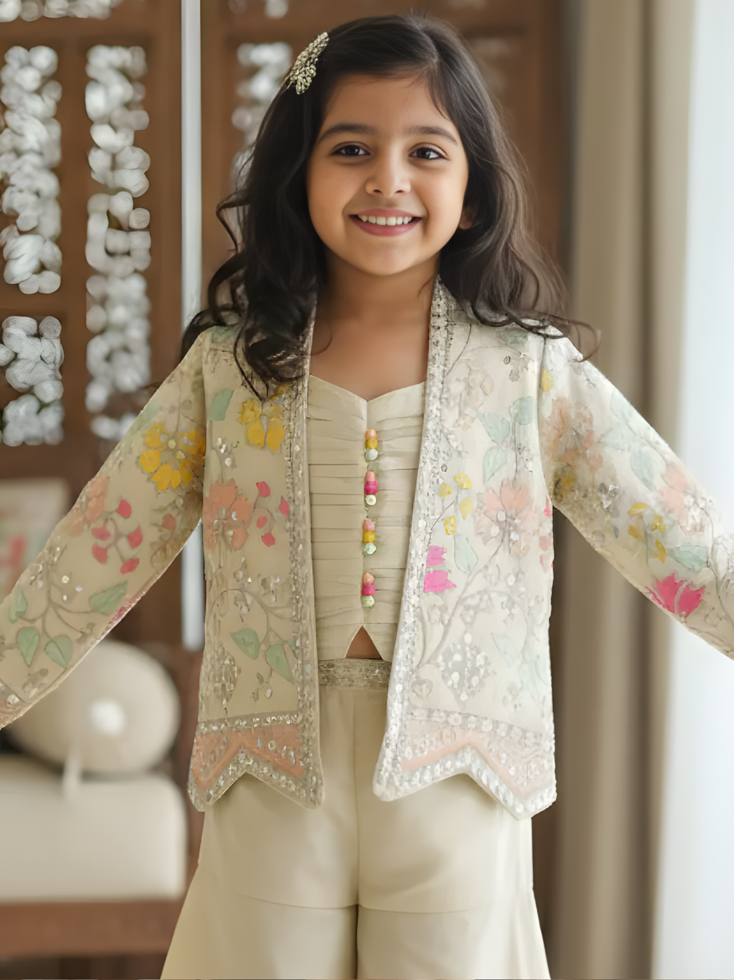 Girls Cream Floral Embroidered Jacket with Ruched Crop Top and Palazzo Set