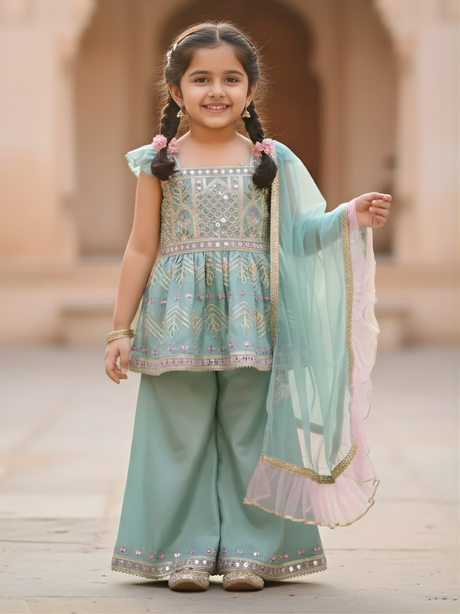 Girls Sea Green Embroidered Peplum PalazzoSet w...