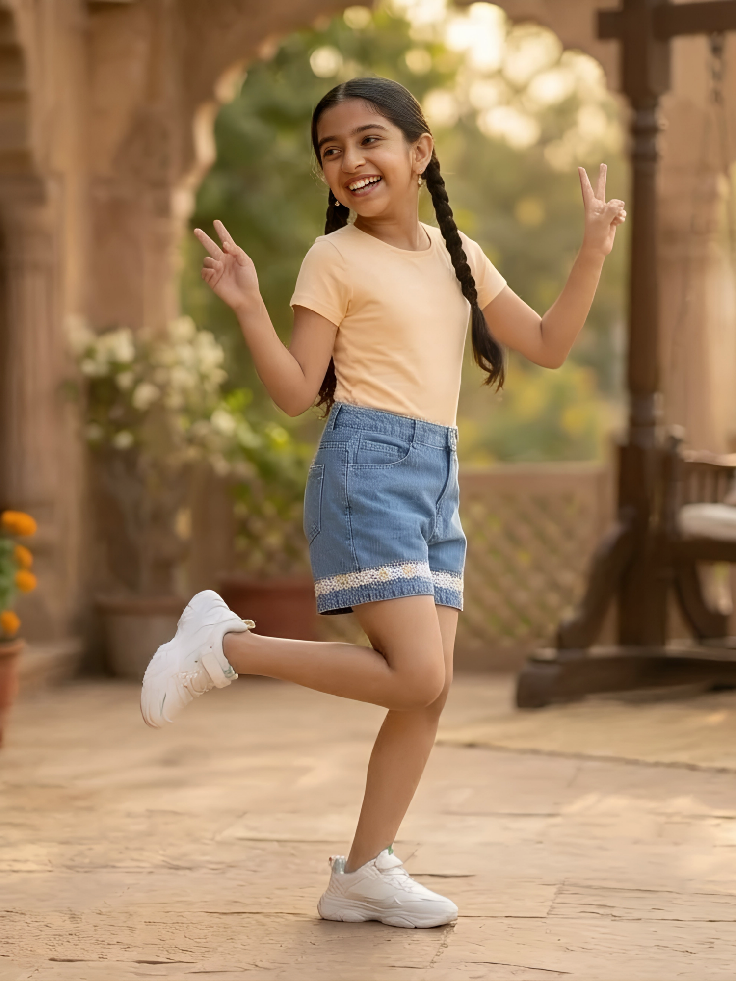 Girls Casual Blue Denim Shorts with Embroidered Hem