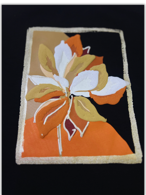 3D Abstract Floral Appliqué: Features a prominent, multi-layered floral and leaf patch in tones of white, beige, and terracotta for a tactile, artistic look. Shimmering Gold Frame: The patch is set inside a rectangle outlined with subtle gold shimmer or thread. Classic Black Base: Versatile black T-shirt base allows the colorful graphic to stand out. Comfortable Fit: Standard crew neck and short sleeves for easy, casual wear. Unique & Artistic: The mixed media design makes this top a wearable piece of art.