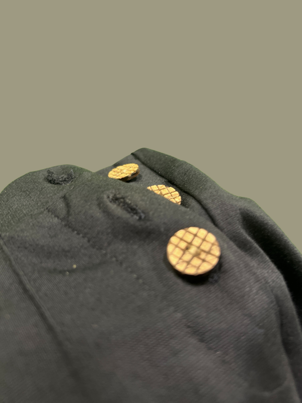 • Signature Detail (Gold Buttons): The defining feature is the gold button detailing, often placed on the front pockets (non-functional or decorative tabs) or along the outer hip, lending a nautical or classic Parisian aesthetic.