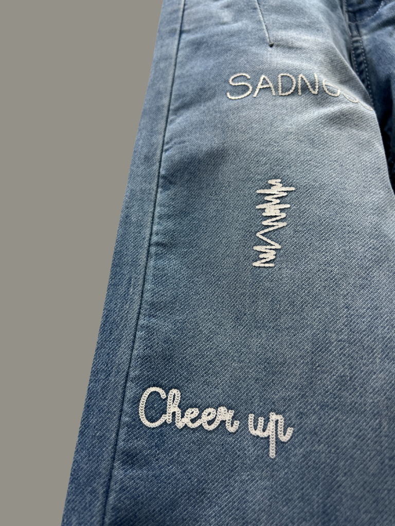 Elegant Embroidery: The denim is embellished with delicate floral or nature-inspired embroidery (often white or multicolored thread) along the legs or pockets, adding a sweet, customized, and high-end feel.