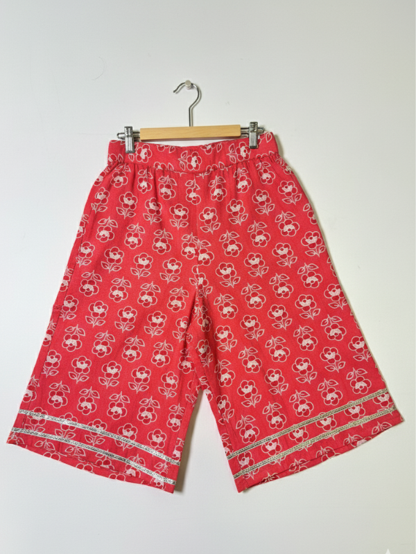 Vibrant Color & Print: Features a lively coral red/deep pink color with an all-over intricate white geometric or folk-art inspired print on both the top and the palazzo pants.