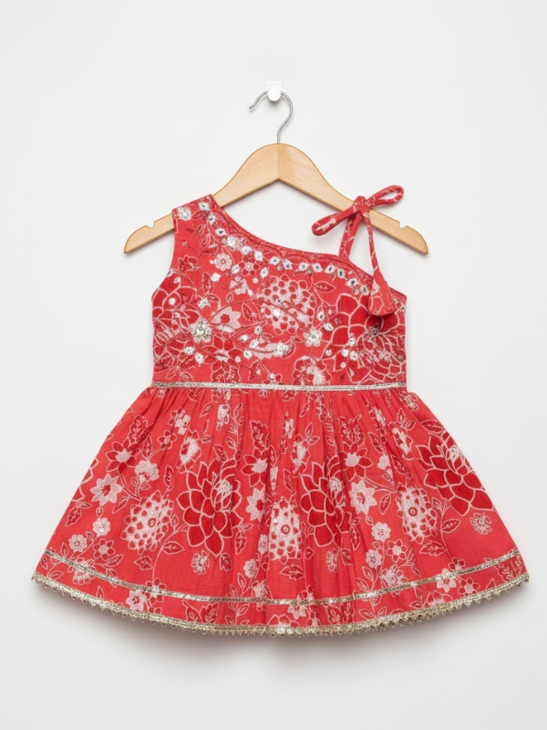 Girls' Coral Red Print Peplum Kurta & Palazzo Set with Dupatta.