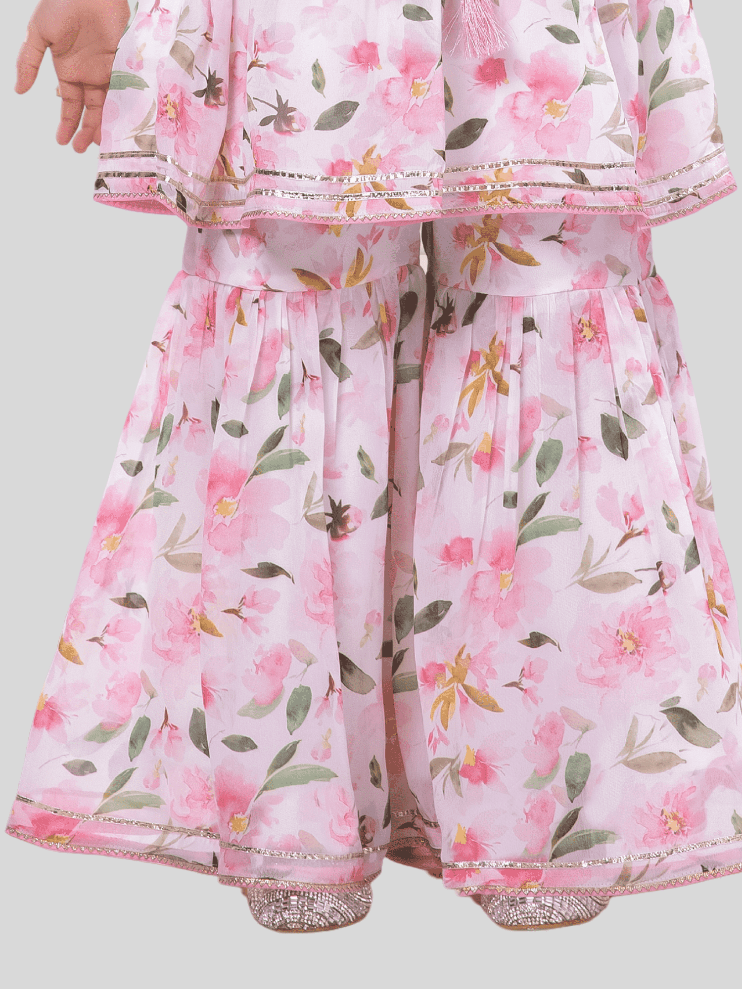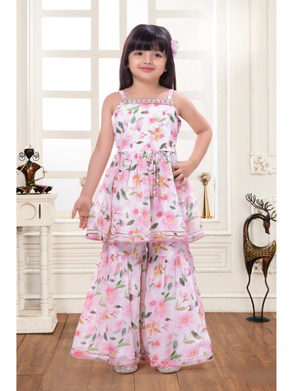 Delicate & Sophisticated: This beautiful Pink Sharara Set features an elegant Kurti heavily embroidered with Pink and Green Floral Thread Work. The Sleeveless Kurti has intricate Sequin and Zari detailing on the placket and a scalloped hem. The set includes matching pleated Sharara Pants with subtle floral accents. Crafted from a luxurious Silk Blend/Georgette, it's perfect for semi-formal events. Perfect for: Daytime weddings, parties, and festive occasions.