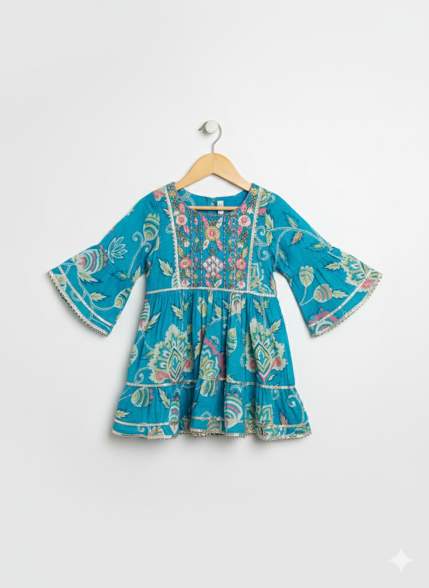 Detailed Kurta: The top features 3/4-length bell sleeves and is adorned with a beautiful, intricate all-over floral and geometric print in coordinating blue, red, and white tones.