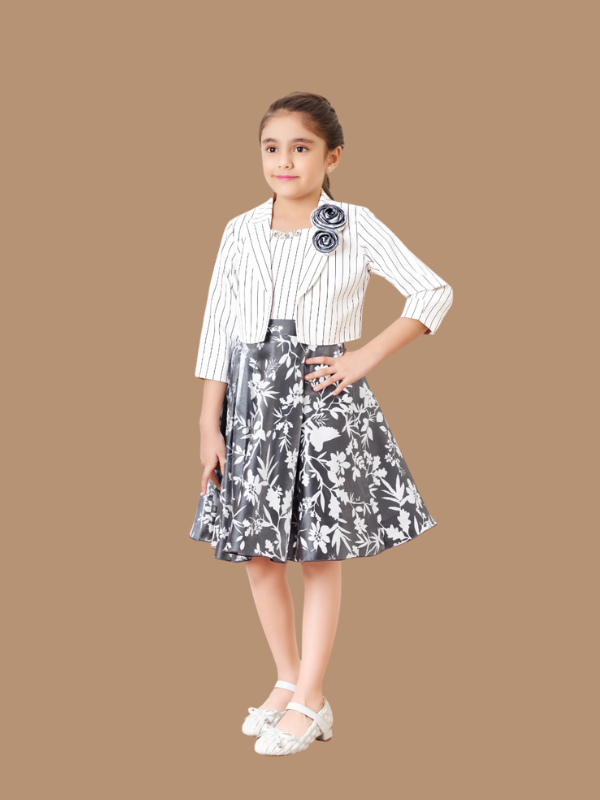 Sweet Silhouette: Designed with a high neck, delicate puffed sleeves, and a gathered waist that flows into a knee-length flared skirt.