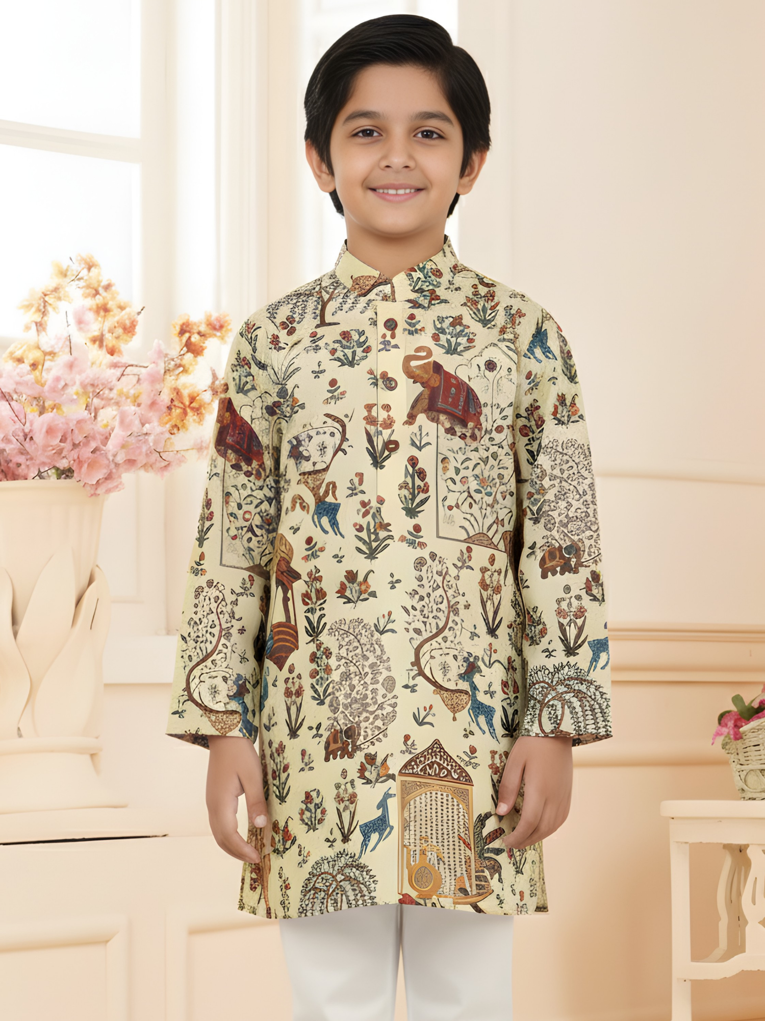 Boys Cream Printed Traditional Art Kurta with White Pyjama Set