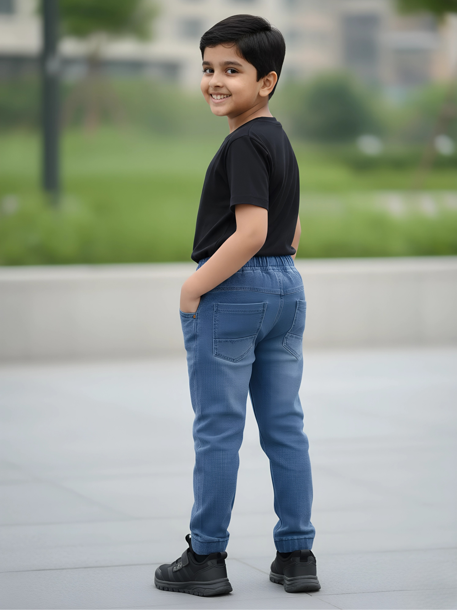 These versatile mid-blue jeans are designed for active boys, featuring a soft-touch denim fabric that ensures all-day comfort. The elasticated waistband provides a flexible fit, making them an ideal choice for both casual play and everyday outings.