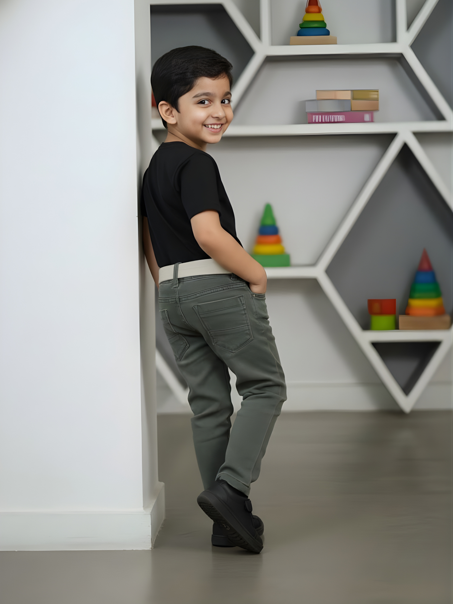 These trendy olive green jeans for boys offer a sleek slim-fit look combined with a practical elasticated waistband for maximum comfort. The set includes a matching stylish belt, making it a complete outfit choice for any young trendsetter's casual wardrobe.