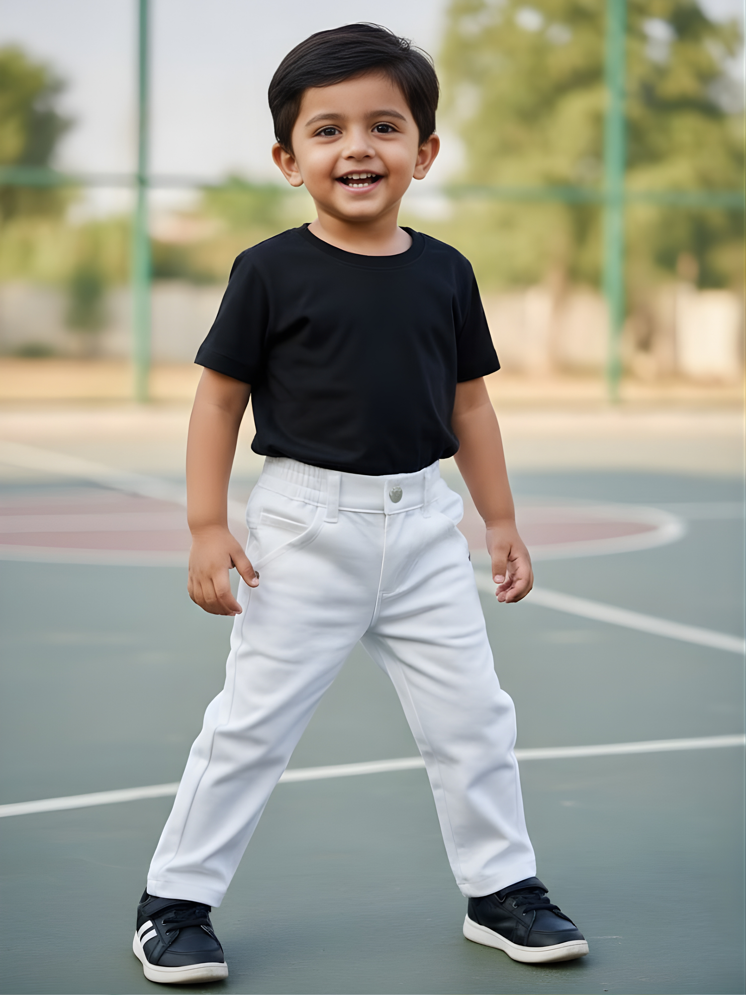 These stylish white trousers are designed for active boys, offering a clean and sophisticated look that pairs perfectly with any shirt or t-shirt. Crafted from a comfortable semi-stretch fabric, they ensure all-day comfort while maintaining a sharp, structured silhouette suitable for both casual outings and special events.