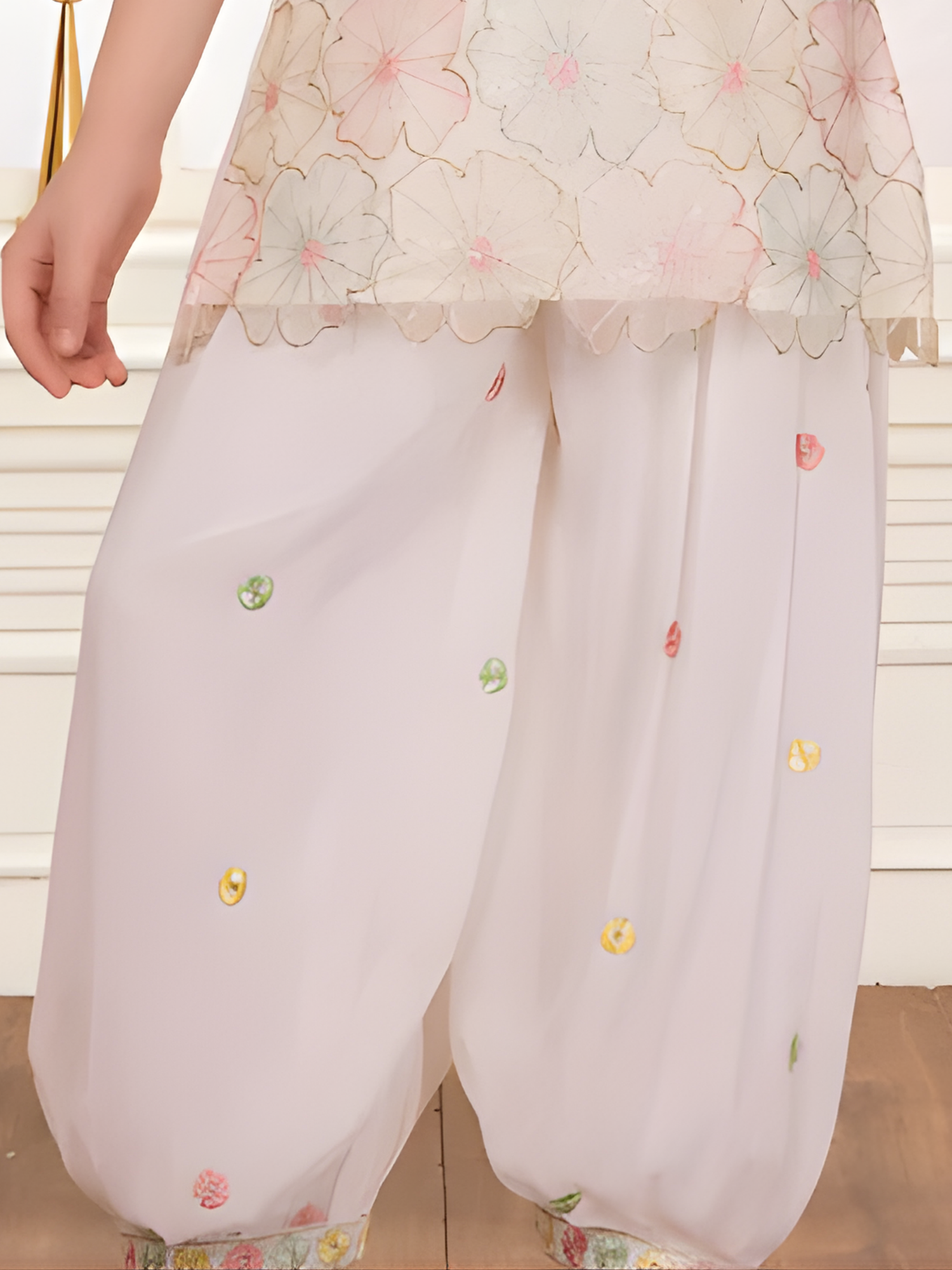 This elegant set is pure sophistication, featuring a sheer sleeveless Kurti adorned with delicate pastel floral embroidery and comfortable Patiala-style Harem Pants. Its soft ivory tones and breathable fabric make it an ideal, effortless choice for daytime festivities and summer celebrations.