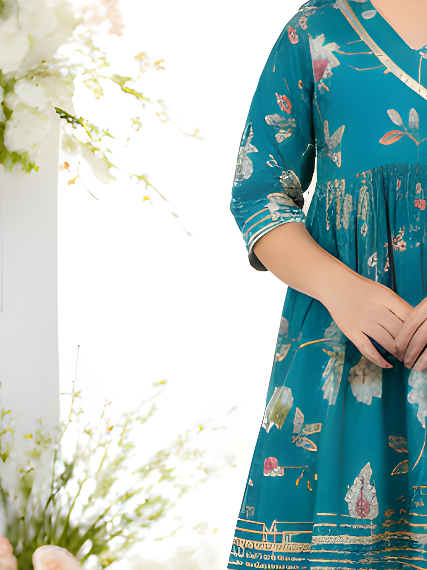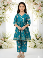 💙 Teal Floral Print Girls' Kurti-Pant Set with Dupatta