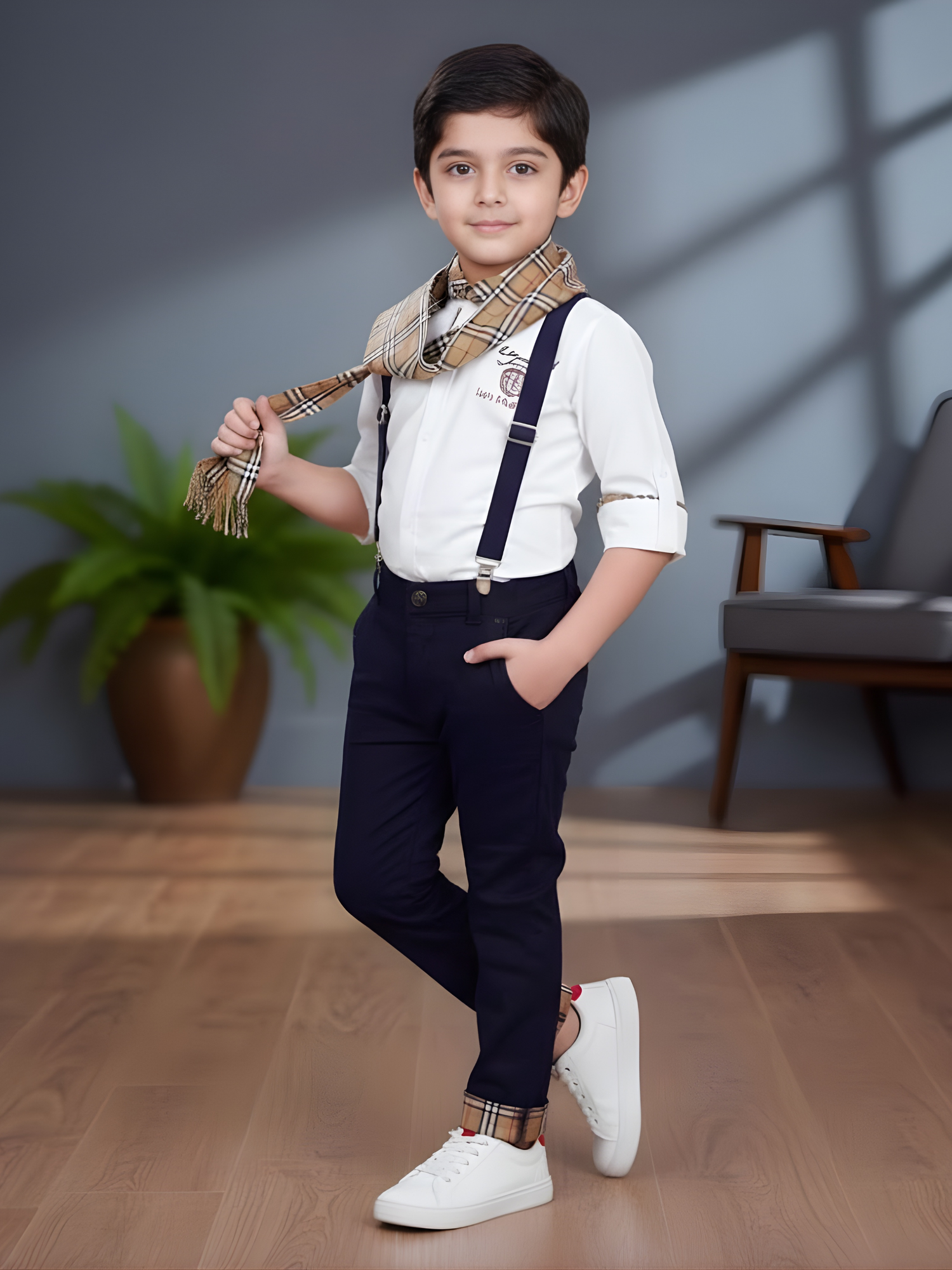 This stylish ensemble features a crisp white button-down shirt paired with sleek navy blue trousers held by matching suspenders. The outfit is elevated by a classic beige checkered scarf and coordinating trim details on the cuffs, offering a sophisticated and modern look for young gentlemen.