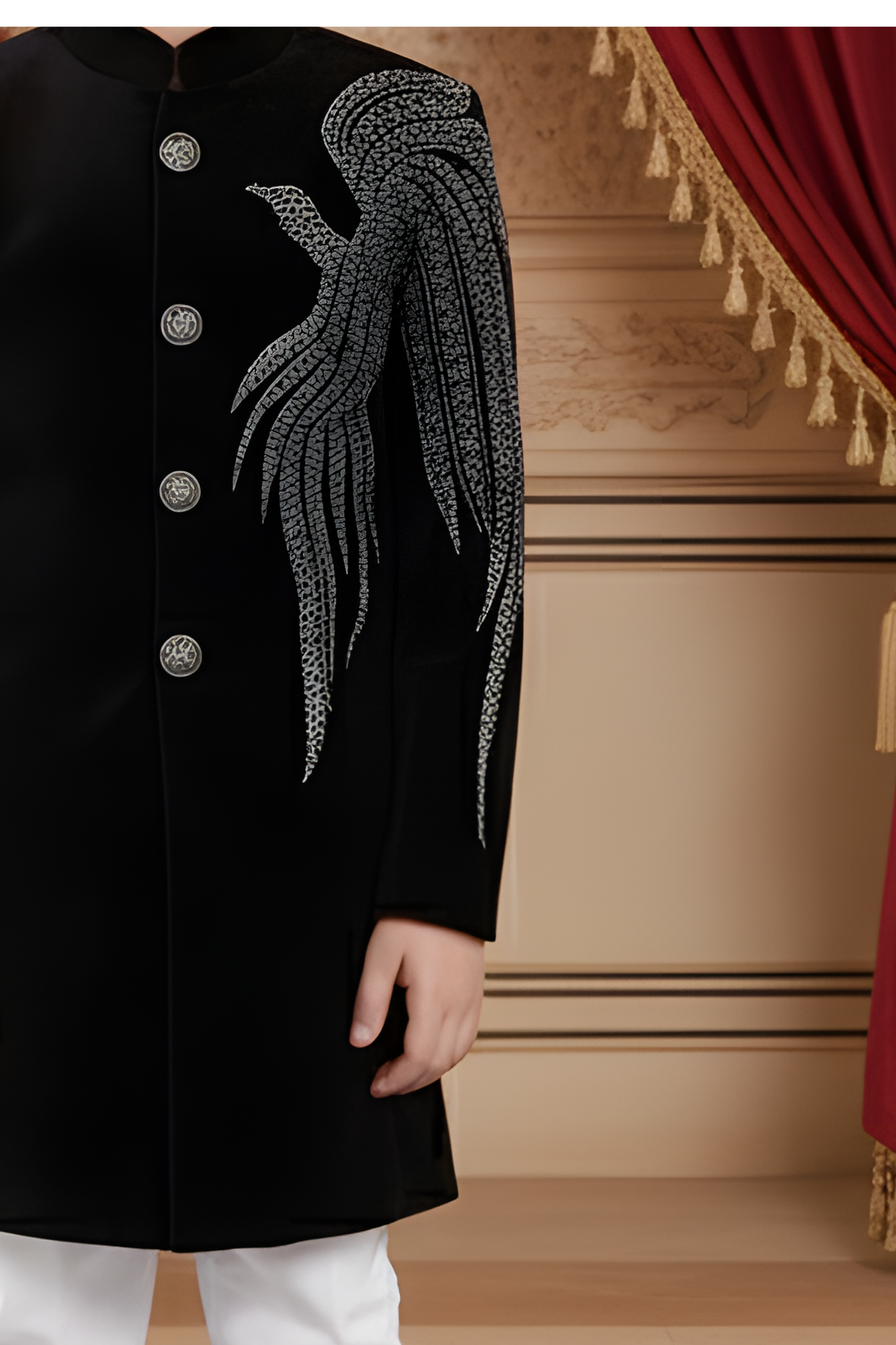 Boys' Royal Black Velvet Achkan with Silver Wing Embroidery