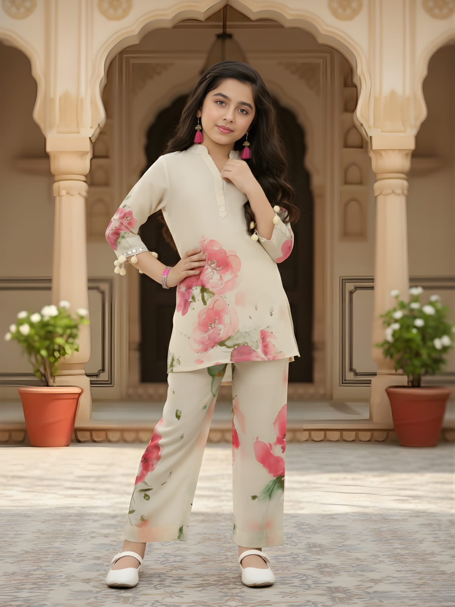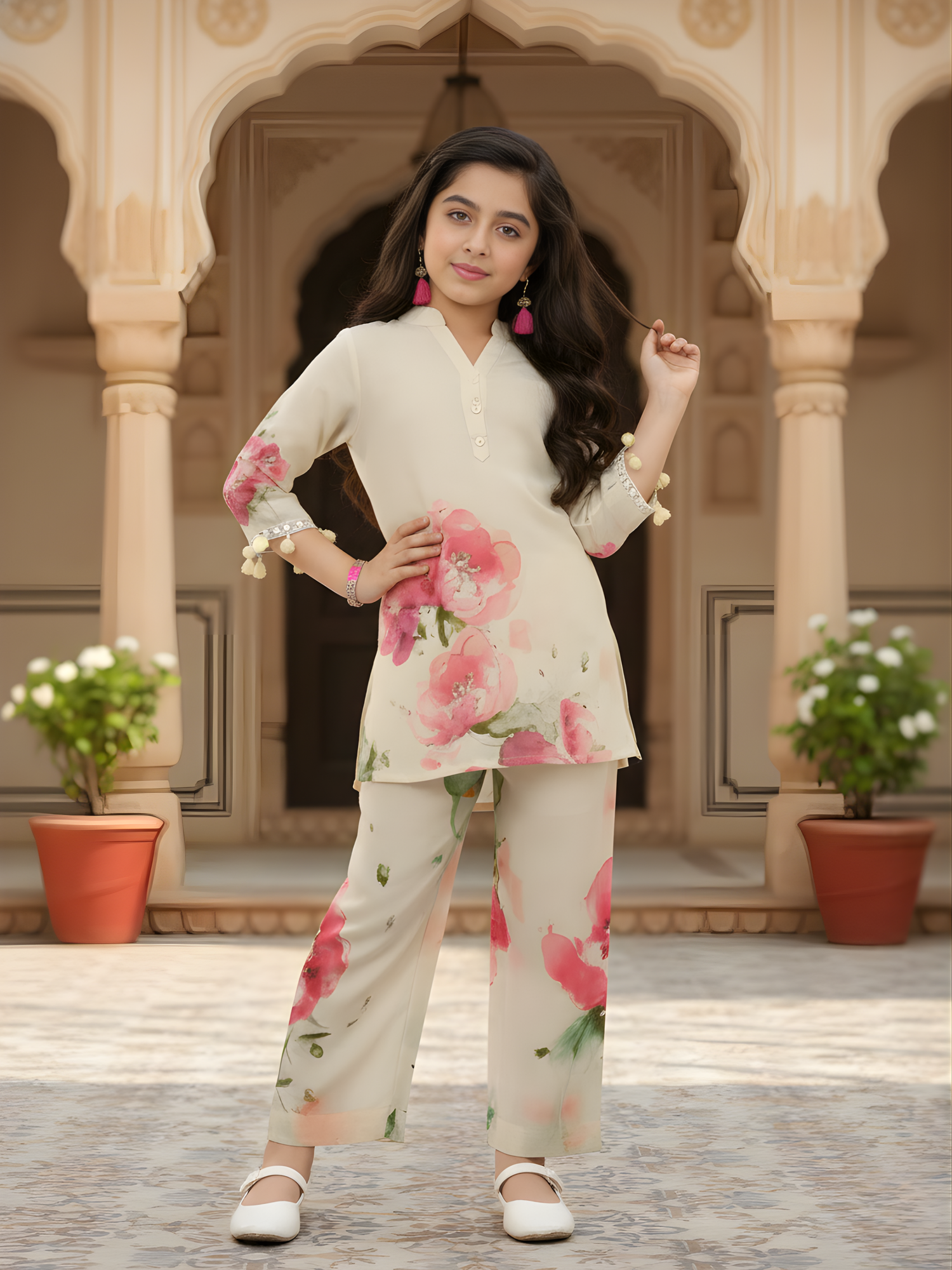 This charming two-piece coordinated set for girls features a soft cream base adorned with large, vibrant pink floral motifs. The tunic-style top is elegantly finished with delicate lace and pom-pom detailing on the sleeves, paired with matching wide-leg trousers for a sophisticated yet comfortable look.