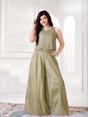 An elegant and modern ethnic ensemble for women, featuring a sleeveless, heavily embellished crop top  in a muted sage/mint green with intricate bead and sequin work, finished with a beautiful, layered fringe/tassel border. The top is paired with high-waisted, wide-leg palazzo pants crafted from a crushed or textured fabric, offering a sophisticated and festive look.