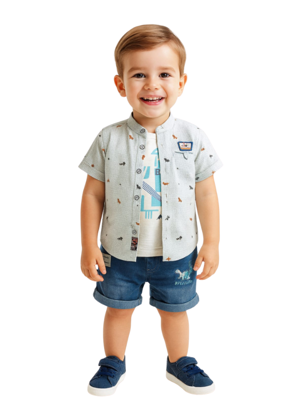 Baby Boy 3-Piece Outfit – Printed Shirt, Graphic Tee & Denim Shorts