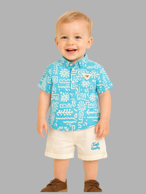 Dress your little one in comfort and style with this Baby Boy Printed Shirt & Shorts Set. Featuring a vibrant blue printed shirt paired with cream shorts, this outfit is perfect for outings, playtime, or family gatherings.