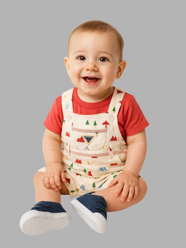 Fun Adventure Print: The cream-colored overalls feature a charming forest/camping print with tents and trees, perfect for little explorers.