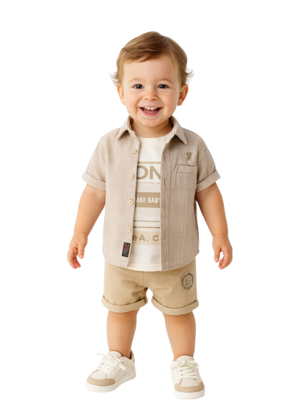 Short Description: Dress your little one in this effortlessly stylish and comfortable three-piece look set. It features a graphic T-shirt, a neutral-toned, short-sleeve button-up overshirt (worn open), and comfortable khaki shorts with a rolled cuff. This layered, monochromatic outfit is perfect for casual events, family gatherings, or a fun day out.