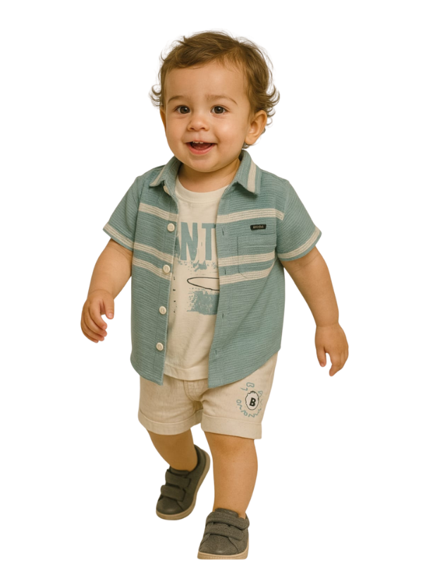 Short Description: Get your little one ready for a day of fun in the sun with this charming and comfortable three-piece set! It features a graphic T-shirt, a lightweight, textured striped shirt (worn open), and soft khaki shorts with a fun patch. This layered outfit is perfect for summer vacations, beach trips, and casual playdates.