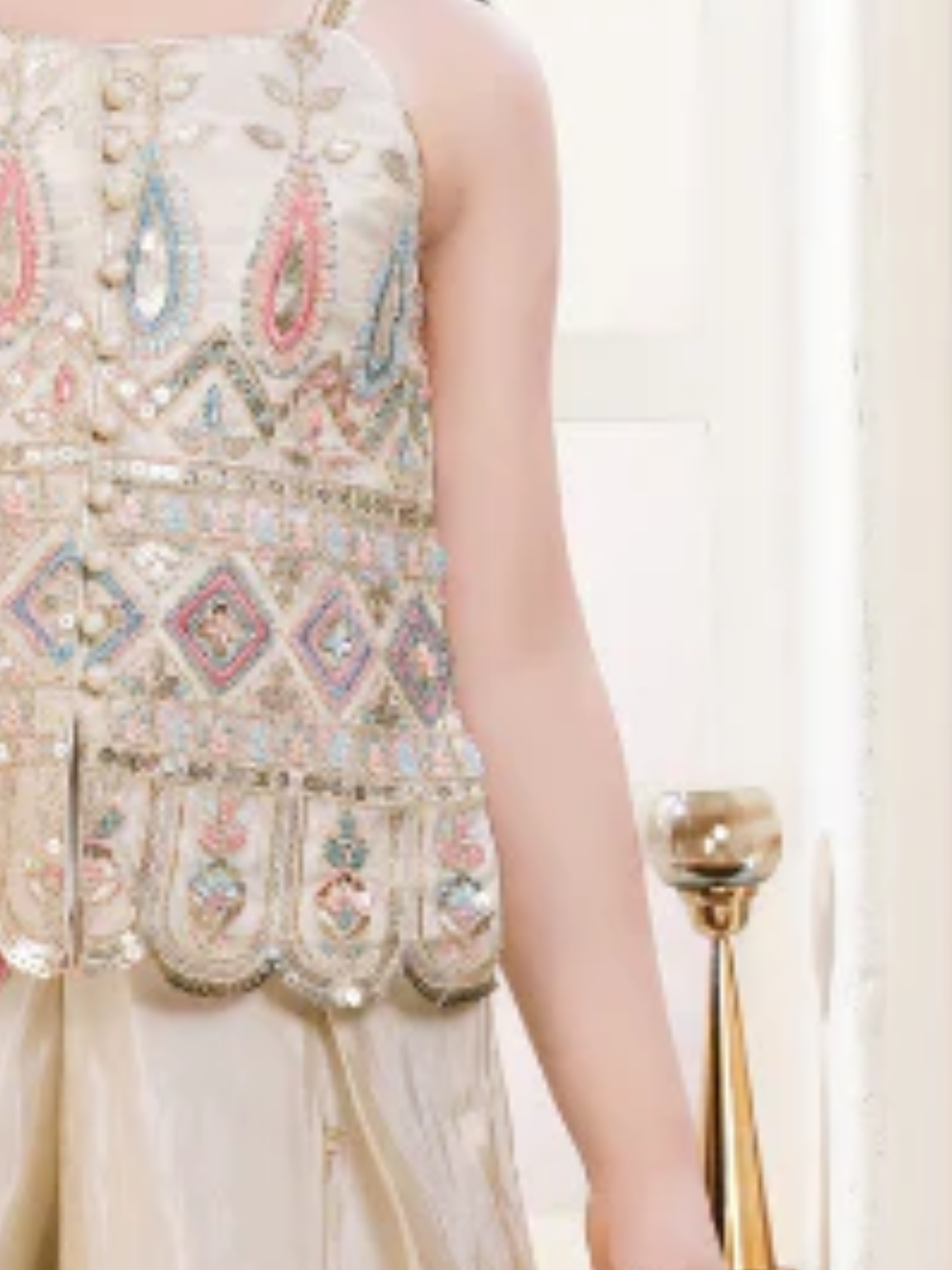 Design Highlight: A heavily embroidered set featuring colorful floral threadwork and scattered sequins over a cream base, combining a modern peplum top with voluminous tiered sharara pants.