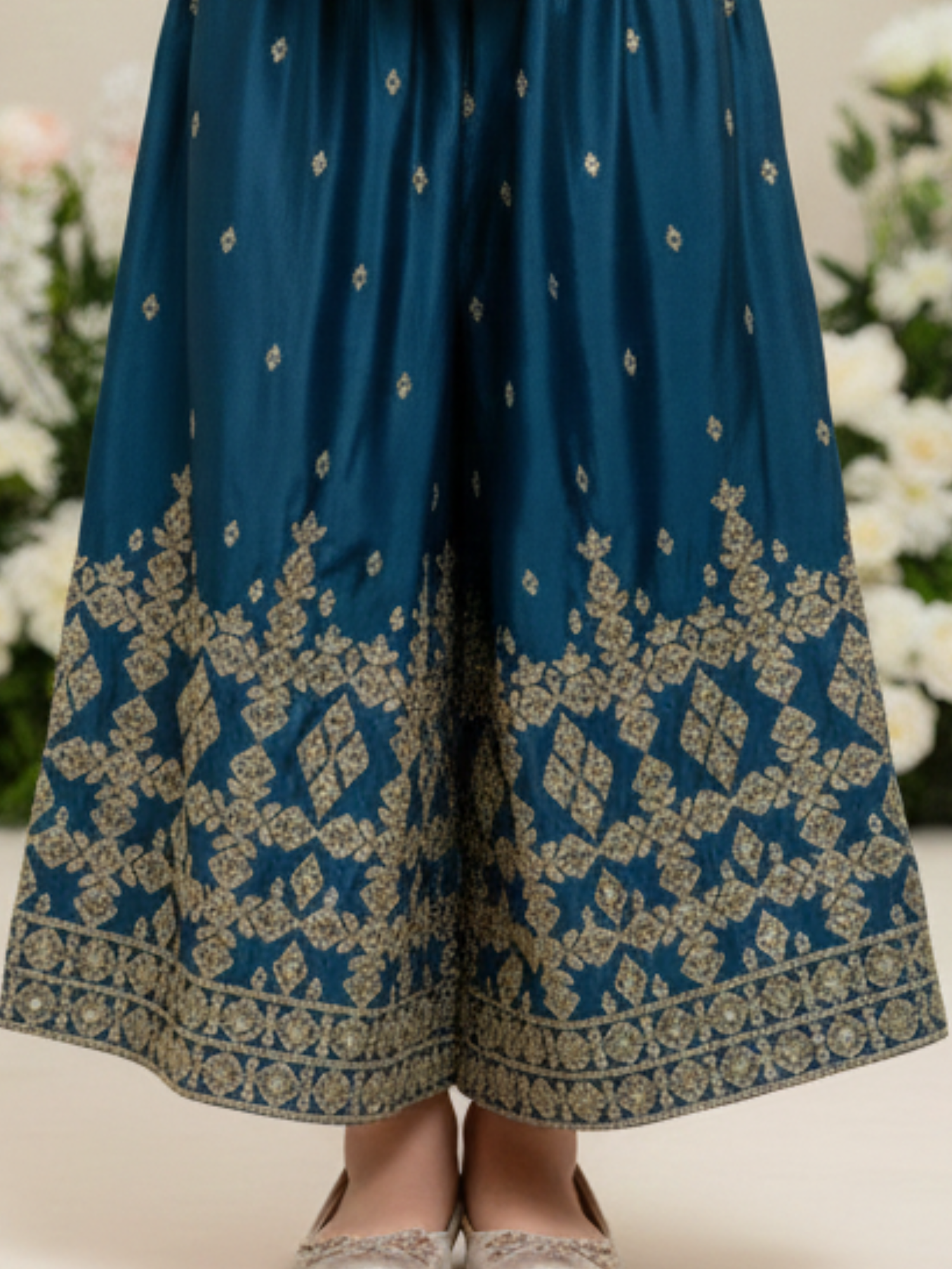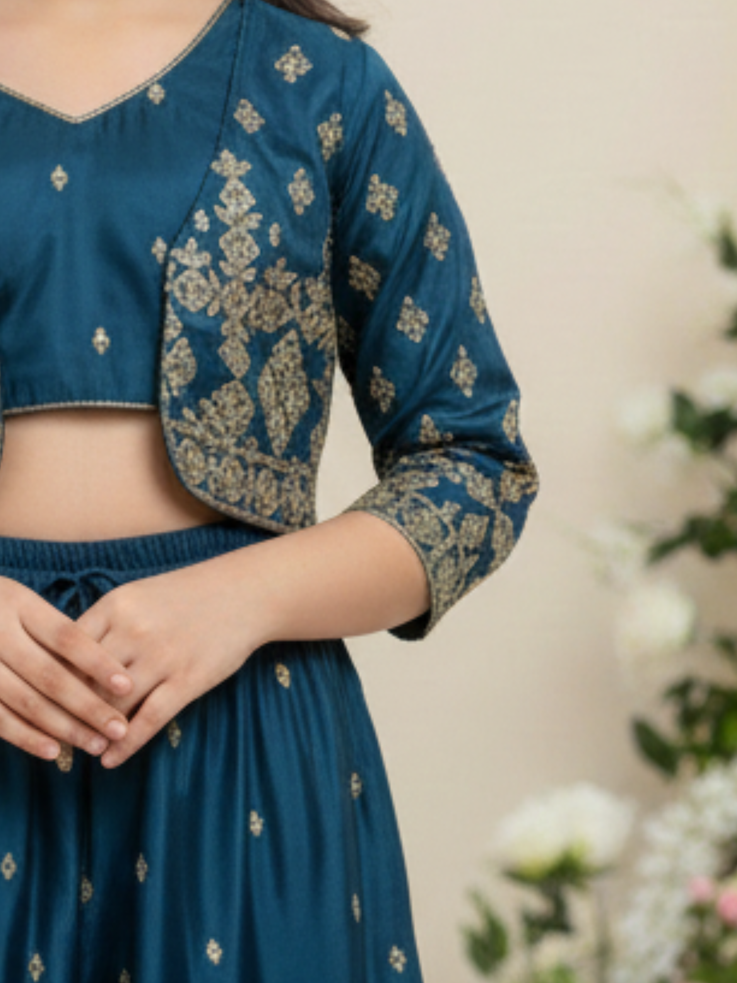 Girls' Deep Teal (Grey) Embroidered Crop Top, Palazzo & Jacket Set