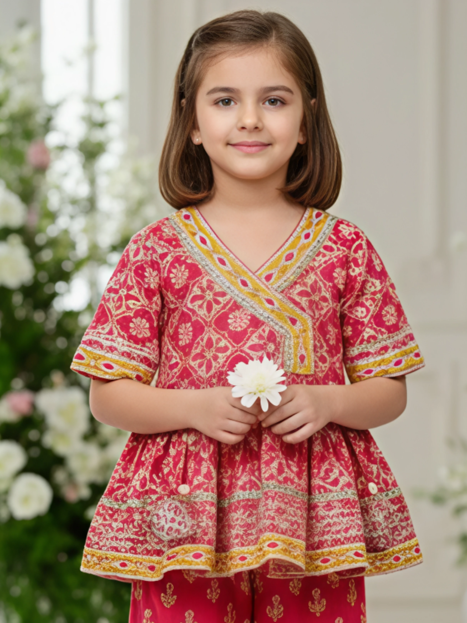 Girls' Festive Fuchsia Pink Print Angrakha Kurti and Tiered Sharara Set
