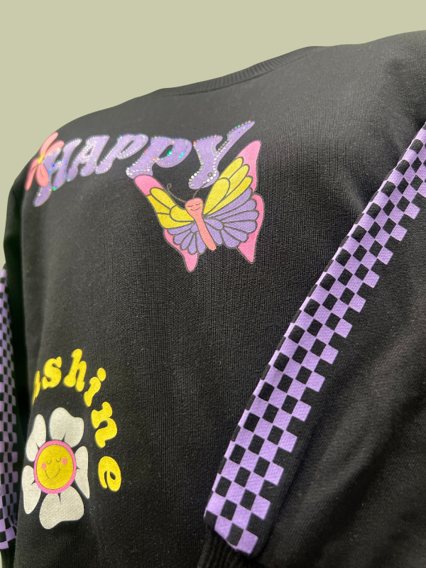 This cozy Black Graphic Sweatshirt is a comfortable and cheerful addition to any child's wardrobe, perfect for spreading positivity while staying warm and stylish.
