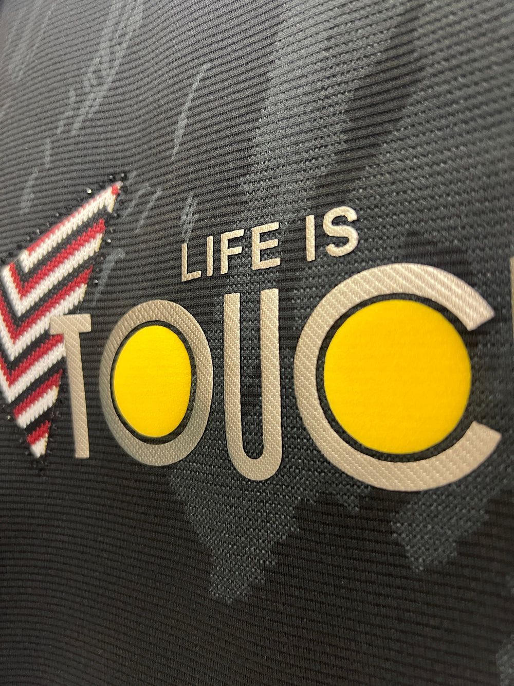 The Graphic: Features the bold and memorable phrase, "LIFE IS TOUCH" (or similar provocative/motivational text). The lettering is typically in a contrasting color (like white, neon, or metallic) for maximum visibility and a strong visual impact.
