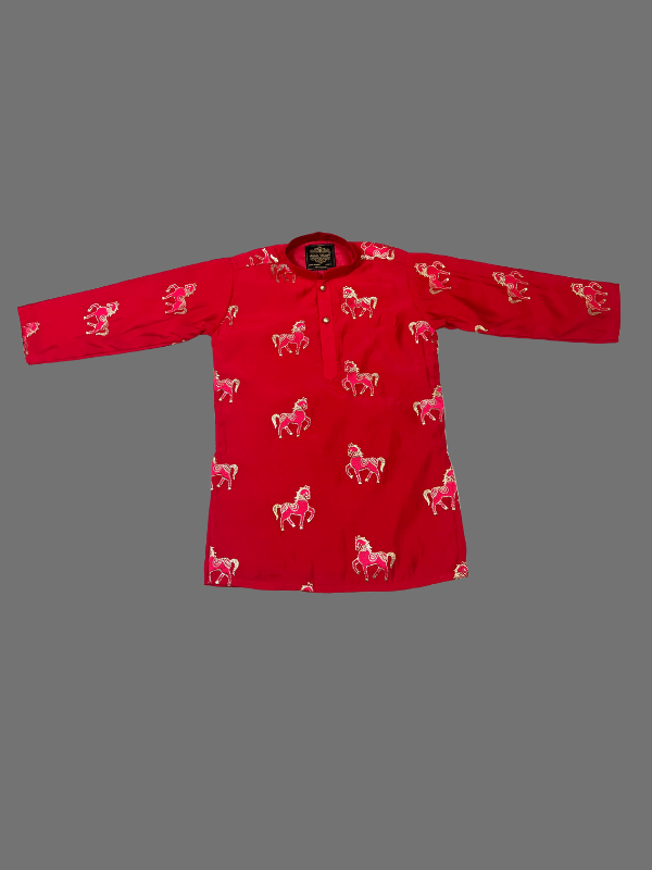 A charming and traditional outfit for boys, this cream kurta with a printed green Nehru jacket is the perfect choice for festive occasions. It combines elegance with comfort, making your child stand out in style.