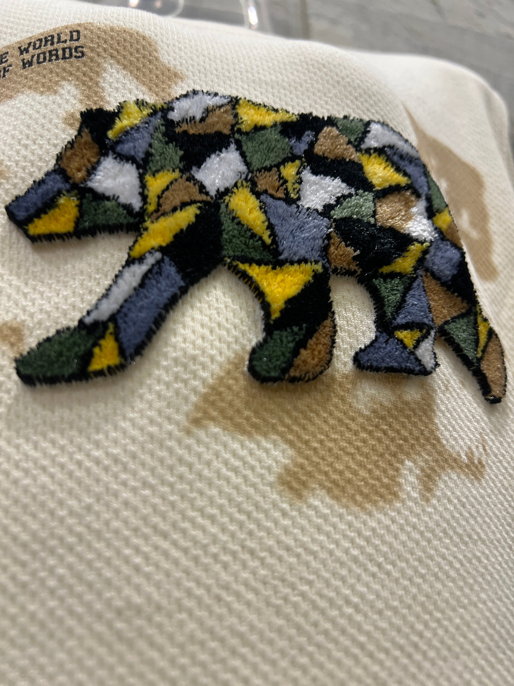 This cozy cream kids' sweatshirt features a bold and artistic geometric bear design with global map elements. A stylish and meaningful piece perfect for cool-weather layering.