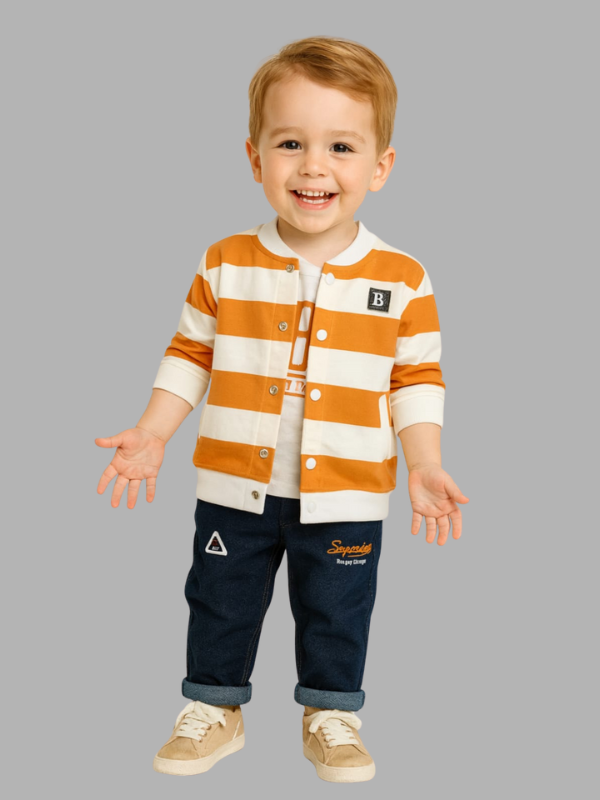 Short Description: Get your little one a cool, complete outfit with this adorable three-piece set! It features a graphic T-shirt, a trendy orange and cream striped cardigan, and comfortable dark denim jeans with a rolled cuff. Perfect for casual wear, playdates, or family outings, this set offers both style and all-day comfort.